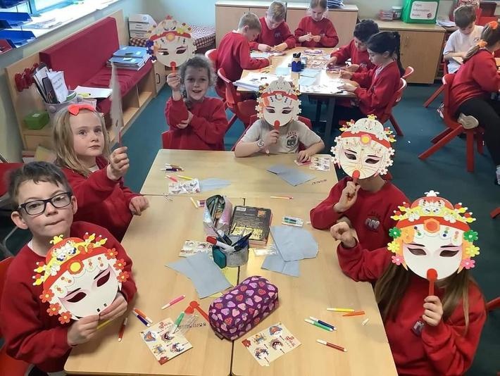 Children enjoyed created craft pieces after our assembly, including Chinese lanterns, bright face masks and 3D paper dragons.